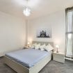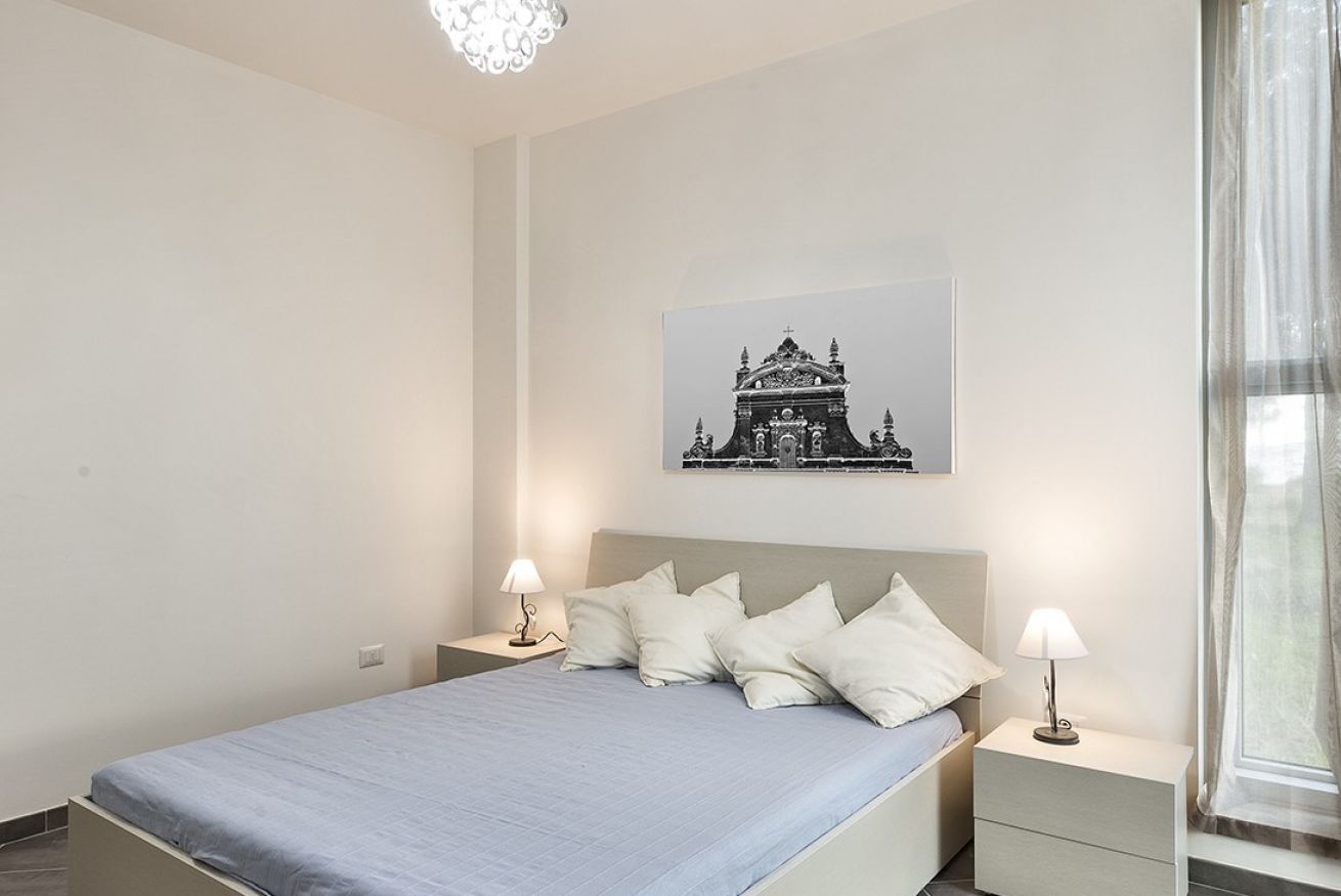 Ampia camera matrimoniale con letto con cassettone sottostante, comodini, armadio a tre ante, cassettiera e specchio. Dai finestroni angolari di cristallo è possibile godere di una splendida vista panoramica.